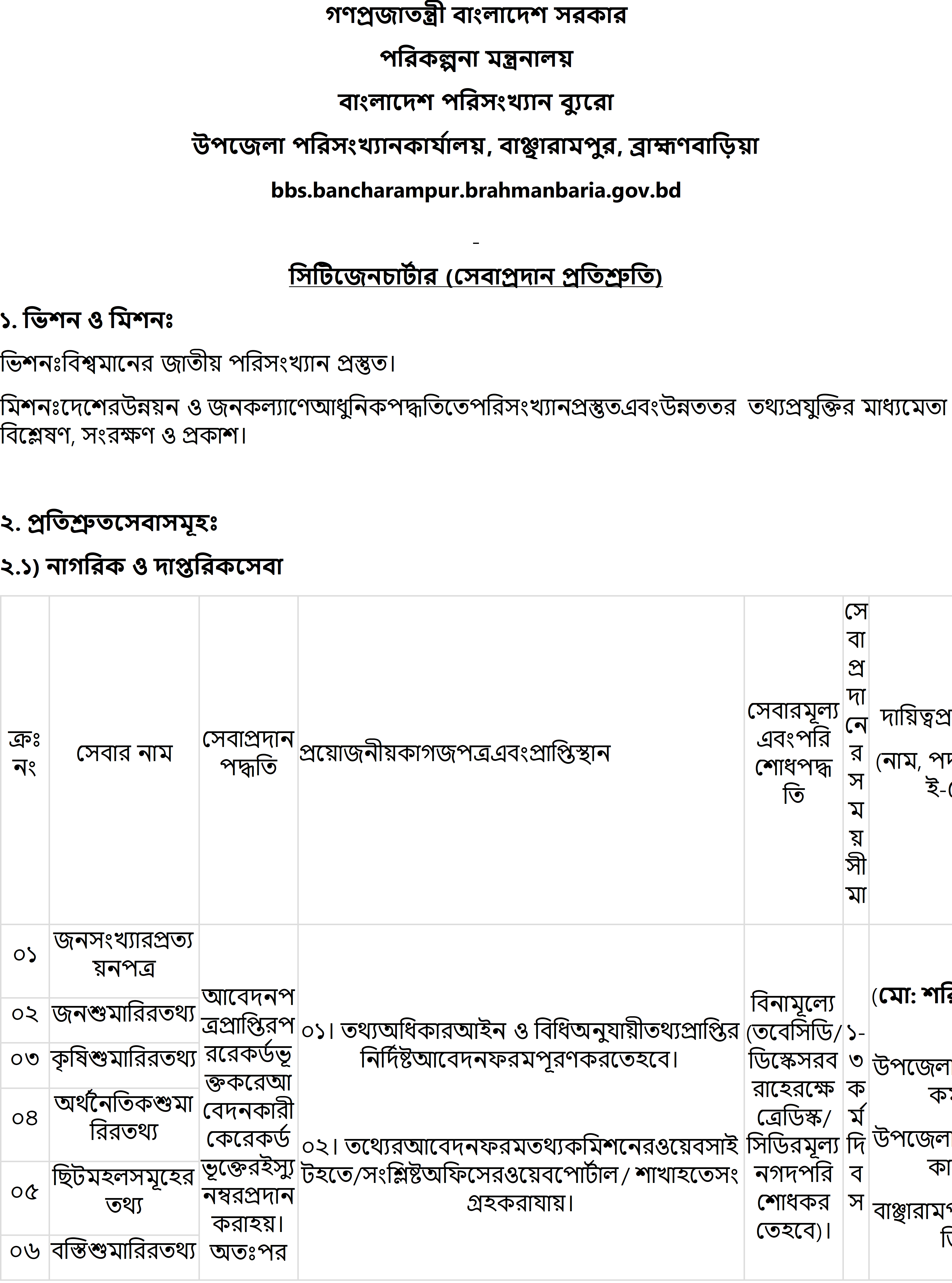 | ০১ | জনসংখ্যারপ্রত্যয়নপত্র | আবেদনপত্রপ্রাপ্তিরপররেকর্ডভূক্তকরেআবেদনকারীকেরেকর্ডভূক্তেরইস্যুনম্বরপ্রদানকরাহয়। অতঃপরআবেদনপত্রপরিসংখ্যানকর্মকর্তাএরনিকটপেশকরাহয়। নির্দেশিতহয়েদায়িত্বেনিয়োজিতকর্মচারীযাচাইবাছাইকরেনির্দিষ্টফরমেটেতথ্যউপস্থাপনকরেন। পরিসংখ্যানকর্মকর্তাএরঅনুমোদন ও স্বাক্ষরেরপরআবেদনকারীকেতথ্যপ্রদানকরাহয়। | ০১। তথ্যঅধিকারআইন ও বিধিঅনুযায়ীতথ্যপ্রাপ্তিরনির্দিষ্টআবেদনফরমপূরণকরতেহবে। ০২। তথ্যেরআবেদনফরমতথ্যকমিশনেরওয়েবসাইটহতে/সংশ্লিষ্টঅফিসেরওয়েবপোর্টাল/ শাখাহতেসংগ্রহকরাযায়। | বিনামূল্যে (তবেসিডি/ ডিস্কেসরবরাহেরক্ষেত্রেডিস্ক/ সিডিরমূল্যনগদপরিশোধকরতেহবে)। | ১-৩ কর্মদিবস | (মো: শরিফুল ইসলাম) উপজেলাপরিসংখ্যানকর্মকর্তা উপজেলাপরিসংখ্যানকার্যালয়, বাঞ্ছারামপুর, ব্রাহ্মণবাড়িয়া। মোবাইল: ০১৭৯৭১১৫৯৮০ ই-মেইল: bbsbanchharampur@gmail.com |